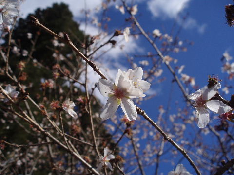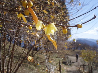 | せっかくですからサイテイ忘年山行の翌日も少し歩いてから帰ろうということに。前日の山行(鐘撞堂山〜)をヒントにまだ早いかな・・・と思いながらもロウバイ目的で宝登山へ。案の定咲いていたのは少しだけ。でもいい香りが漂っていました。見頃はやはり1月、2月、遅ければ紅梅、白梅も一緒に見られます。 | ||