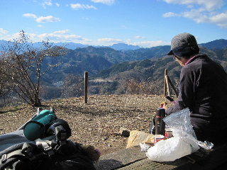 | 今日も温かい陽気だったので山頂でのんびりします。目の前には両神山も。 奥秩父のほうも眺められ、良い気分。 |