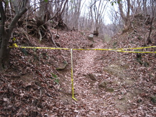 | ところが登っていくと、林道を横切るようにあった登山道には危険という立入禁止の黄色テープが・・・ あらら・・・ |