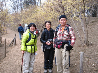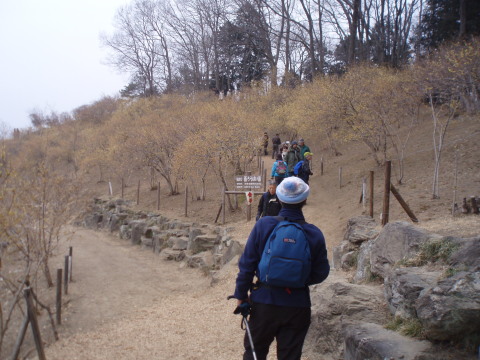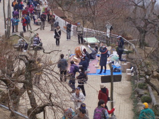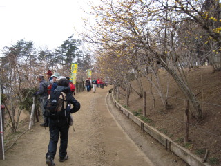 | 山頂で。 温かい一日だと思っていたのにとても寒く感じられた山頂でした。下山して1時ごろで5℃でしたから、山頂では0℃近かったかもしれません。 展望は霞み、両神山や武甲山などすっきりとは見えず残念でした。 それでも空いたベンチに座り、コッヘルのお湯で温かいコーヒーを入れ、パンで早目のランチタイム。 そのあと又ロウバイ、梅を楽しんで下山しましたが既に観光客でいっぱいでした。 |
