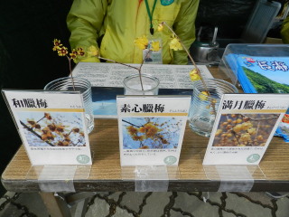 | ロープウェイ乗り場の前には蝋梅の説明など。 ここは和蝋梅(花の中心が赤い)、素心蝋梅(花びらの先がとがっている)、満月蝋梅(花びらが丸い)の三種類があるそうですが、素心蝋梅と満月蝋梅の中間もあるそうで、分かりにくいものもあるということでした。 |