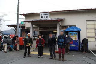 今回のコースは長瀞アルプスから宝登山へ。 秩父鉄道長瀞駅に車を置き、一駅先の野上駅へ電車で向かいますが、長瀞駅には¥さん、まゆ太さんが既に到着でした。 おそらく別コースか、あるいは来られないと思っていたのでビックリ嬉しでした(^^ゞ |