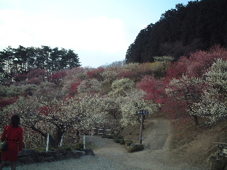 天気;快晴 Member.2人(夫婦) 【コ ー ス 】 (〜は歩、休憩時間含む) 登山口(神社P)15:05〜宝登山山頂・梅園15:45-16:20〜登山口(神社P)16:50 【宝登山山頂で】右 四阿屋山に行った後、途中のファミレスで食事を済ませ、時間が早かったので梅が咲いているという長瀞の宝登山に寄ってみることにした。夫はあまり気が進まなかったようだが、渋々・・・\(^-^)/ 長瀞駅の側で、花園ICへ続くR140沿いに大きな白い鳥居があり、その下を車のまま入っていく。正面に神社の駐車場があり、そこへ車を置いて正面の登山道から登っていった。駐車場がいっぱいの時は左側に有料駐車場がある(普通車500円)。 最初は車が通れるほどの広い道路を登っていき、舗装はされていないとはいえこのままこの道を行くのかとがっかりしていた。しかし途中から登山道を行く。広い道路はロープウェイの山頂駅まで続き、この道路を常に横切るような感じで登山道はつながっていた。登山道が道路のせいでぶつぶつと寸断されたようだ。