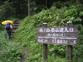 | 氷ノ山は雪景色を見てみたかった。でもなかなか歩けない山域で、こうして歩けただけでも嬉しい。 午前は扇ノ山を歩き、こちらに移動してきた。登山口にはポンプで水が引かれ氷山命水と大きく朱書きされた看板があった。なぜかそばにはプレハブの小さな小屋があり、見張り番のようなおじさんがいた。おじさん?・・私もおばさんだ!でも年はおじさんの方が上のような気がする(^-^;・・・。自分がいくつくらいに見えるのか自覚していないが、トシちゃんを見れば似たり寄ったりのおじさんだ。 はじめは下山して来た人に登山道の様子を聞いていたのだが、そのおじさんがいたので別ルートのことを聞いてみた。とっても親切な人で、事細かにいろいろと話してくれる。コースは仙谷コースから氷ノ山越へ周回しようと思っていたのだが、岩や鎖場などがあり、少し雨模様のこの日は滑りやすくて危ないと言う。時間もエアリアマップのコースタイムとは違うようだ。氷ノ山越コースなら往復4時間あれば行ってこれると言うのだけれど、エアリアマップでは登り3時間、下り2時間弱なんだよね・・・。出発時間がもう正午になっていたため、少しでも早く登れるコースにしようということで、ここは素直におじさんの言うことに従い、氷ノ山越コースをピストンすることにした。