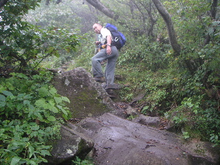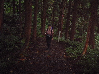 登山口で出会った人は東からの風が強く吹いてすごかったと言っていたし、小屋で会った今のご夫婦は足元がすごいと言うし・・どんなに大変なのかとやや不安な気持ちで歩いていたが、拍子抜けするくらい穏やかな登山道だった。 ブナ林と笹林で両脇は囲まれ、登山道の道幅は広い。多少ぬかってはいたが歩きにくいというほどではなかった。吹きさらしではなかったし、歩くと熱くなるので半袖で十分。人によって感じ方が随分と違うものだと思った。