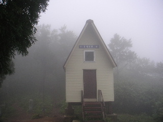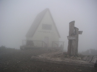 その近くに大きなダイセンキャラボクがあると聞いていたので見回したが分からなかった。後から聞くともう少し下に下りたところだったようだ。 ガスがかかって残念ながら周囲の展望はまったく無い。小屋の中に入ると少し前を歩いていた2グループが食事中だった。それぞれガスを出して温かいものを作っている。今回持ち上げなかったのでちょっと後悔。でもおかげで小屋の中はいくらか暖かく感じた。小屋は氷ノ山越避難小屋より広い。土間があって直火ができるようになっている。ここでメールチェック。小屋の中は送受信しにくく、外に出るとすぐにつながった。