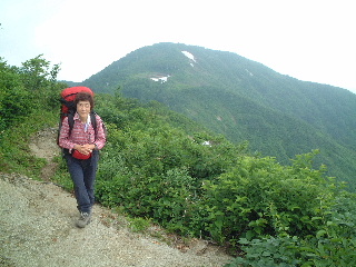 起き上がって出発。左手へひとまず下り、シラネアオイやニッコウキスゲなど眺めながら、何回かアップダウンを繰り返して先へと進む。 稜線に吹く風は優しく爽やかで心地よい。登山道の両脇に、まだ残雪がかなりあるせいか! |