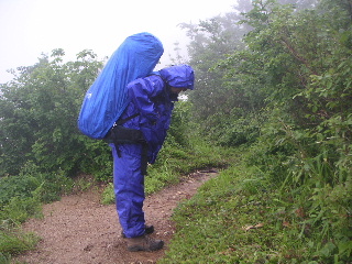 | 概ね歩きやすい登山道だが一箇所こんな岩場もある。雨で濡れているので滑らないように気をつけて通過。ガスっているが良く見れば右側はきれ落ちている。 | |||||||||||||