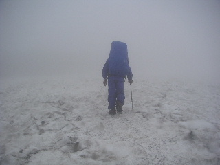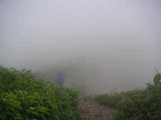 | 雪渓を3度通過し、最後はついに6爪アイゼンを出す。ここの雪渓が一番距離が長かった。 切合小屋へ二手に分かれる分岐は左側を行った。笹が横倒しになった滑りやすい登山道を抜けると三国岳からの道と合流。ますますガスが濃くなった。数メートル先が見えない(左写真)。 しかし小屋は近い。ここまで来ればルートははっきりしている。 これまでの途中の水場は残雪で埋もれていたようだ。切合小屋まで行けば管理人がいて、水はふんだんにある。 |