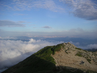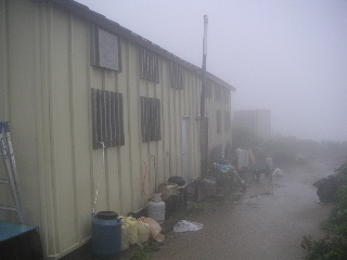 | 一ノ王子に着くと前方に本山小屋が見えてきた。雨は上がっていたがガスがたちまちの内にまた隠してしまった。 小屋に着き、荷物を置いて一先ず山頂へ。山頂まではコースタイム15〜20分。 |