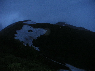 | 小屋で昼寝(コレばっか!笑)して起きると、夕暮れ時。ガスが晴れて山頂方向が見えてきた。明日登る雪渓の様子をよく見ておく。 翌日の天気予報は良くなかったが3時に目覚まし。その夜も雨。何度も昼寝したのに夜もぐっすり眠れた。 |