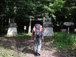 鳥居を潜り、ゆっくり登っていった。登山道は雨上がりで滑りやすくなってはいたが、緩やかな登りで歩きやすい。気温は20°くらいで林の中は清々しかった。しかし爽やかな気候にもかかわらず、たちまち汗が吹き出してきた。