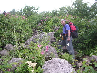 上に行くほどにウツボグサ、シモツケ(シモツケソウ?)、ウスユキソウ?、クガイソウ、ヨツバヒヨドリ、トリアシショウマ、ハクサンフウロ、クルマユリ、ホツツジなどあり、楽しめた。
