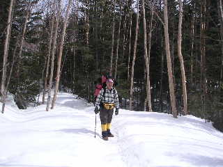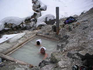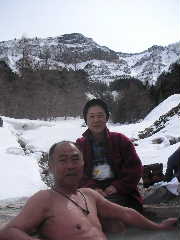 とりあえずお風呂セットと山行セットを入れたザックを背負って登っていった。広い場所に出たところで夏沢峠と野天風呂の分岐があり、野天風呂の方に行ってみた。正面にダイナミックな硫黄岳と眼下には川、そして一面の雪景色!なんてワイルドなロケーション。ちょうどご夫婦らしき男女一組が一緒になった。自分で歩いてこなければ入れないお風呂に入るのが楽しみで混浴も気にしないからと、先ずは奥さんが目の前でさっさと入り、ご主人が一生懸命写真を撮っていた。私たち夫婦がいてもさほど気にする風でもない。脱衣室も無く、寒風の中での服の脱着は勇気がいるが、その奥さんのさっぱりとした潔さが私には羨ましくもあった。それならばと夫が震えながら入り、ご主人も続いて入った。桜の散り際の潔さが好きな私だが、それは私に無いものだから・・・結局私は足だけ入れて仲間に入れさせてもらった。寒かったのでそれだけでも温まる。 |