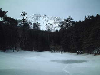 しらびそ小屋前のミドリ池は本来もっと大きいのだろうが、周囲が凍って小さくなっていた。その小さくなった池の淵まで人の踏み跡が続いている。歩いていくのはちょっと怖そうだけど、暖かくなっていく春、いつごろまで歩けるのだろう。見上げると正面には東天狗岳が見える。こちらから見ると双耳峰ではないせいか最初天狗岳とは思えなかった。 池の脇を通り抜ける時は南壁面を見せた稲子岳があり、その向こう側にはかつて行った事のあるニュウがある。少し先へ歩いて行くと、そのニュウや天狗岳方面に向かう中山峠への分岐があった。しらびそ小屋に泊まるのもいいなぁ・・・。この日営業中。 |