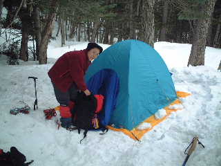 15時半ごろテントに戻り、お湯割の梅酒(自家製)を二人で飲みながら夕飯の支度。メニューは餅入り寄せ鍋とミートボール、おつまみなど。16時ごろになると雪が舞ってきた。もし山の方に行っていたら今頃は下山している頃だなぁ・・・と思いながら少量の雪見酒で気分上々。温泉で体はぽかぽか、湯冷めもせずとっても良い気持ち。17時半ごろにはシュラフに入った。 この夜に限って花粉症がひどかった。どうやら家で干してあったフリースやシュラフにごっそり花粉がついていたらしい。狭いテントで最悪!でもテントで良かった。小屋で鼻ジュルジュルでは鼻かみも気を遣っただろう。21時ごろ目覚めてからはあまり寝られず時々ウトウトする程度。辛かった。いつしかテントにあたる音は雨のよう・・・。しかし・・・ 【二日目21日)】 翌朝起きてみると雨ではなく雪の音だった。雪にしてはかなり強い降りだった。そして明け方の強い風。3時半に起床の予定だったが寝不足とこの音で気持ちが鈍る。結局花粉症で寝ていられず10分後くらいには起床。昨夜の残りと炒めたウィンナーで朝食を済ませ、飲み物など準備して外の様子を見る。風は相変わらず強い。気温はマイナス14度くらい。それでも支度だけはして、行けるところまで行くことにした。 |