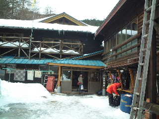 四人でそうしている間にも男性が一人、二人とやってきて、少々戸惑いつつも次々と入った。おせっかいにも私は皆さんのカメラマンを買って出る。オバサンだから出来るんだぁ・・!と皆さん思うでしょ?さにあらず、あとから小屋にお風呂代を支払いに行った時、話した若いお嬢さん方も野天風呂に入りに行くと言ってましたよ。どうやらオバサンだから入れなかったらしい・・・・デス!私はおとなしく石楠花風呂に入りました(^o^; 下界の温泉のようなきれいなつくりではないが、とっても良い湯加減でしっかり温まり極楽、極楽。 |
