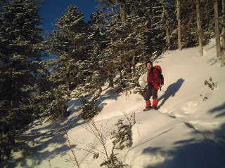 新たな積雪は5センチくらいだったろうか。まだ誰も歩いていない新雪を踏みしめながらまだ静かな小屋の前を通過し登っていく。野天風呂の分岐を夏沢峠方面へと進むがトレースはすっかり消えていた。広い場所で、前日の記憶を頼りに間違えないよう進んでいく。そこを通過するとかすかなトレース跡とテープがあった。見覚えのある硫黄岳の位置から野天風呂を眼下に認め、樹林帯へと入っていった。だんだんと明るくなり、目の前の硫黄岳に朝日があたって輝きだした。新雪をかぶった樹林帯も登山道も朝日でキラキラ輝いている。朝一番乗りって、なんて気分いいのだろう! |