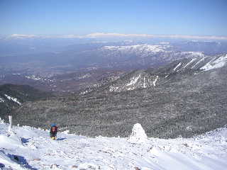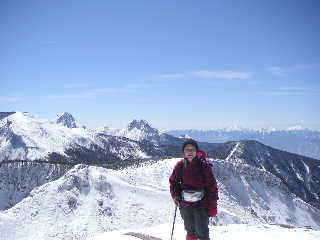 再び同ルートを下山。前方に北八ヶ岳、その左に中信高原、右に浅間山方面、その周りには中央アルプス、御嶽山、乗鞍岳、北アルプス、谷川岳、尾瀬方面などなど・・・素晴らしい展望じゃ〜!!しかし下りは早い。 夏沢峠で一休み。この頃になるといくらか人が増えてきた。時間も早いし天気も良いので、私たちは天狗岳にも足を延ばすことにした。長い樹林帯も青空と新雪のおかげでとても明るい。途中から見える浅間山と周辺の山もきれいだ。でも夫はバテてきたらしい。登りきったところ、箕冠山(新潟の箕冠山は「みのかむりやま」と読むらしいがここはなんと読むのだろう?)山頂辺りで待っていると言う。ならば一緒に下りようと言えば「一人で行って来いよ」と言う。じゃあ行ってきま〜す(>.<) いつも思うのだけど、私一人で心配じゃないのかなぁ・・・。どうも夫は、自分は人間で私は人間じゃないと吹聴している節がある・・・<オイオイ(-.-;。 根石山荘の前を通り、根石岳に向かう。コマクサ保護区でロープが張られているが、このロープは広い場所なので視界の悪いときなど安全かもしれない。根石岳に登ると双耳峰の天狗岳が目の前だ。途中本沢温泉への下山路があるが、積雪期は通行不可のようだ。本沢温泉小屋の人も通らないようにと言っていたらしい。もちろん踏み跡はなかった。通過して東天狗岳へ。人がいても夏山の喧騒とは程遠い。硫黄岳のような風はなく、穏やかな気持ちの良い山頂だった。素晴らしい展望につられ、またいつこれるか分からないので西天狗岳も行ってみた。夫を待たせているというのに。でも行かなかったらきっと怒るだろう「なぜ行かなかったんだ!」って。(笑) |