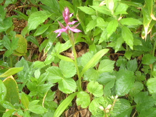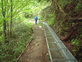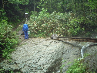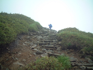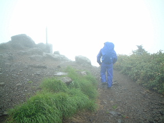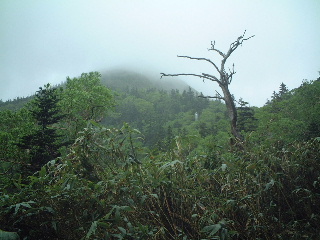 天気;雨のち晴れ Member.2人(夫婦) 【ノッキリの手前から見た岩菅山】右 28日:岩菅山 【コ ー ス 】 一ノ瀬P8:05〜聖平分岐(小三郎小屋跡)8:43〜アライタ沢9:00〜ノッキリ10:40〜岩菅山山頂11:27-12:40〜ノッキリ13:00〜金山沢の頭14:50-15:05〜寺子屋峰(寺子屋山2125m)15:17〜高山植物園15:43-16:00〜ケーブル乗り場16:00-20〜一ノ瀬P17:00 いつもいつも直前になって行き先が決まるという慌ただしさ!いくつかリストが上がった中で、気になっていた奥志賀の岩菅山に行ってきた。ここは出来れば切明温泉から縦走したいと温めていたところだったのだが、交通の便が悪く、ずっと棚上げしていた山だった。それで今回は縦走を諦め、烏帽子岳までのピストンで避難小屋泊にすることにした。お花を楽しもうと出かけたのだが、結果は天候が思うように回復せず、その日の内に下山、翌日は別の山に行くことにした(→笠ヶ岳と池めぐり)。 前夜出発、一ノ瀬無料駐車場(スキー場なので通り沿いにあり広い)で3時間ほど仮眠。起きたときは青空が見えていた。喜んで支度をしているうちに雨・・。その日は温泉にして登山は翌日にしようかと思ったが、予報では回復の見込みだったので予定通り出発した。小屋泊を主張する夫と日帰りにしたい私とで意見は分かれたが、結局小屋泊装備で行くことになった。 一ノ瀬から上条用水脇の登山道を行くが、登り口ははっきりしない。見当をつけてスキー場の方へ行き、地図(昭文社エアリアマップ)を元に進んでいった。東舘山の裾野をアライタ沢まで平坦な道が続いている。少し大きめのU字溝の側で味気ないが、両脇にはまだニリンソウなど咲いていた。 途中、車道の方の登り口(聖平)からの道と合流、小三郎小屋跡と呼ばれる場所で、なるほど小屋跡?があった。なおも緩やかな沢沿いを行くと木の橋がありアライタ沢(荒板沢)と書かれている。橋を渡るとそこからは登山道らしい登りとなっていく。緩やかに階段も続く。 ヨツバムグラ、マイヅルソウ、エンレイソウ、アカモノ、ゴゼンタチバナ、イワカガミ、ミゾホオズキ、ツマトリソウ、ミツバオウレンなど次から次へと現れカメラをしまう間がない。ということで登りには時間がかかってしまった(今回はずっとこんな調子だったが・・)。気持ちの良い高木、低木の樹林帯に囲まれ、雨に濡れた緑はどれも生き生きして見える。もう少し前だったらツツジの花もきれいだったことだろう。 木の合間から少しガスがかかっている焼額山が見える。すっかりスキー場のゲレンデと変わり果てていて、登りたい気がそがれるが、この岩菅山を眺めるにはいい山かなとちょっと興味をそそられた。ノッキリまで時々岩菅山頂を望みながら歩いていくが、ガスで次第に展望もないまま、足下の花を愛でながら登っていった。ツバメオモトも今を盛りに咲いていた。途中で下山者3名に出会ったが、地下足袋で大きなザック、合間からネマガリダケがのぞいていたからそれを採りに来た人たちだろう。登りでは他に誰とも出会わない静かな山歩きだった。 ノッキリは尾根上の通過点にすぎない。ここからきつくなると記録にはあったが平らな道を行くと、なるほど間もなく今まで以上に登りがきつくなってきた。おそらくは展望が素晴らしいのだろうに、残念ながらガスできかず、やはりお花を楽しみながらの登りだった。イワナシの花は既に終わり、ウラジロヨウラク、オオバキスミレ、ハクサンチドリ、ツガザクラが沢山咲いていてとてもきれい。セリ科の花だろう白い花も咲いてはいたが、ミヤマトウキだろうか?よく分からない。 ガレ場と地図には書いてあったが、歩き慣らされた登山道ではあった。雪は全く残っていず、完全な夏山だ。しかし山頂に着いて、雨のため避難小屋で休憩したが、汗でびっしょりの体はどんどん寒くなってきた。濡れた合羽を脱いで干し、昼食をとりながらこの後どうするか相談。そのうち2パーティがそれぞれやってきた。林間学校下見の中学の先生方と、若い3人の男女で、小屋の中は一度に賑やかになった。こんな日に登るのは私達だけと思っていたら、やはりいるものである。彼等は全員東舘山空中ケーブルで登ってきて、この後一ノ瀬に下るという。 小屋の中はストーブもあり、マキもあった。中はきれいではなかったが、板敷きで避難小屋の機能は充分備えている。外のトイレは使わない方が無難との情報ではあったがそれは昨年までのことで、今回見たらきれいに作り替えられていたようであった。しかし建て付けが悪いのか雨で湿っているせいか、戸がしっかり閉められなかった。 山頂には石塔や祠があり、そこそこの広さがあった。天気が良ければ展望が良さそうなのに残念だ。せめて裏岩菅山まで足をのばしたかったが、行くなら予定通り烏帽子まで足をのばしたいという気持ちと、花見とはいえ展望のきかない中を歩いても・・という気持ちが交錯。しばらく様子をみながら待っていたが、雨は止まず。翌日はお昼頃まで