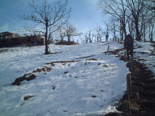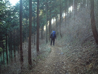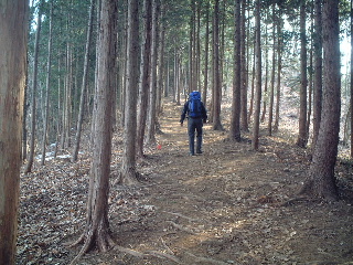明王峠に近づくともう雪は無くなった。気楽に歩いていった。明王峠からもいつもは見える富士山が見えなかったのでそのまま通過し、下山。相模湖駅までのルートを辿る。ここを通るのは何年ぶりだろうか、10年近く前になると思うが、それでも憶えているものだ、懐かしい。一度林道を横切ってそのまま又山道に入る。杉の植林の中を捲き道に沿って、しばらくは平坦だ。杉林はうっそうとしているので一人で歩くとしたら、急いでしまいそう。話し相手がいればこそのんびりと歩けたというか、歩いた。