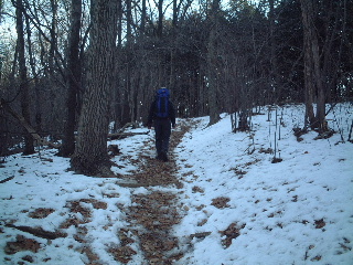 山頂でゆっくりと展望を楽しんだ後、明王峠へ。こちらはしばらく雪道が続いた。ほとんどがコチコチだったが、マラソントレーニングしている学生等がいたので一部泥んこになっているところもあった。ここで滑ったら腰を打って大変。尻餅ついたらこれまた大変。といってアイゼンを使うほどでもなく、この下りではストックを使い気をつけて下山。