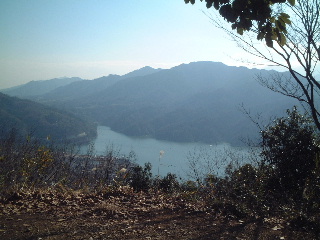 なかなか下りの道にならないが、樹の間からキラキラ輝いている相模湖が見えてくると間もなく下り道になる。振り返ると急だが、下る傾斜に無理はない。