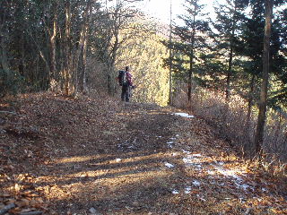 一つ目の林道を横切ります。あと一回、あわせて二回林道を横切ることになります。車で山頂近くまで行ける山ですが、この林道を通るのではないようです。この林道は生活道か作業道がメインなのでしょうか。気にせず横切れば、静かなハイキング道が続いています。 |
