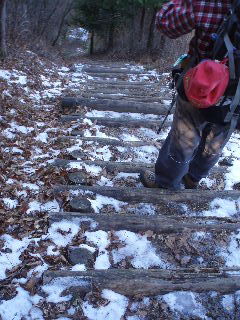 階段の下りで凍結。アイゼンは持ってきていません。こういうのは苦手です^_^; 慌ててストックを出し腰が引けた状態でそろりそろりと下りていきました。