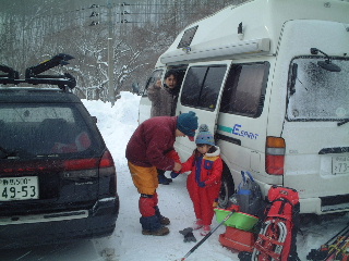 出発は4時。運転は夫に任せ、いつもなら起きている私も、連日の年末仕事の疲れから隣で熟睡。関越道ではいつのまにか雪に変わっていた。途中、渋滞があり、現地に着いたのは9時半頃だった。雪だ!雪!孫は嬉しそう!天気は雪がちらつき、山の上はガスで霞んでいる。ブランクの後、いきなりこんな日に登るのも嫌だな・・・と思ってしまう。孫とそり遊びの方がいい・・なんて思っても、せっかく来たのだからとばかり、夫がどんどん山道具を車から引きずり出す。・・・・・・(^-^;;;
