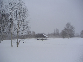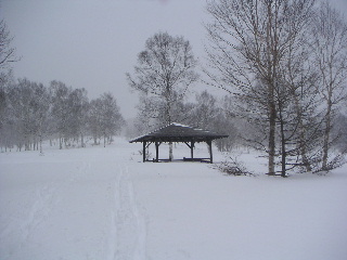 途中の東屋を目安に進んでいき、二つ目の東屋で小休止。といってもテーブルなど雪で隠れてしまっていた。静けさが何とも良かった。もう少し先に進んでみる。二人で交代してラッセルするが、30分ほど進んで振り返ると先ほどの東屋がまだそこにあった。こりゃ駄目だ・・・!もし私達二人ならこの景観を時間かけてもう少し堪能しただろう。しかしここ7,8年スキーをしていないという長男夫婦のために早めに下りて、孫の守をしてあげることにした。