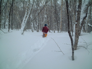 こうして一人戯れた後満足して、夫の待っているところへ戻った。自分で作った新雪のラッセル跡は崩れてなおもフカフカとしていた。