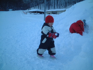 そりに飽きたあとは雪遊び。雪だるまは新雪でまとまらず、固まっていた雪をなんとか雪だるまに見立てたり、坂を利用して滑り台にしたり・・・。小さな手に雪遊び用の大きな手袋はやりにくそうで、遊んでいてもすぐにはずれてしまうが二人とも夢中になっていた。