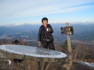 | 後から登ってきた男性は小野子山へ行かれるそうで、早々に軽アイゼンを装着していました。おそらく女坂から登り、男坂のほうから下るのでしょう。 食事をしたわけでもないのに、この雄大な展望というご馳走を存分に楽しみ、あっという間に1時間以上も過ぎていました。穏かなお天気で幸いでしたが、少し下山したところで5度くらいでしたから、山頂の気温はもう少し低かったかもしれません。 |