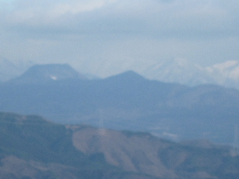 浅間山、真っ白です。 手前には浅間隠山や鼻曲山。 その左には妙義山系も連なっていると 思うのですが・・・ |