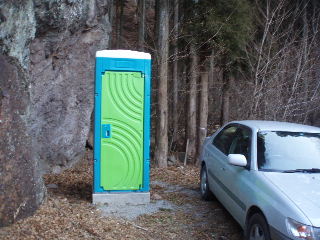 | 十二ヶ岳登山口駐車場と新しい標識。広く普通乗用車は30台以上置けそうです。観光バス用も3台ほどのスペースが確保されていました。 東屋の手前にも新しい簡易トイレ。一つしかありませんが、ここも最近設置されたようです。 |