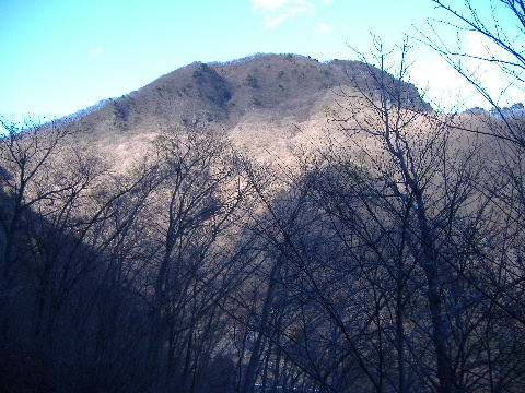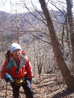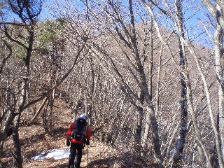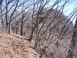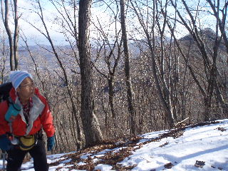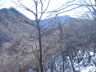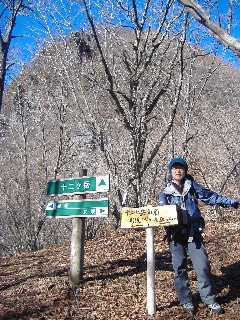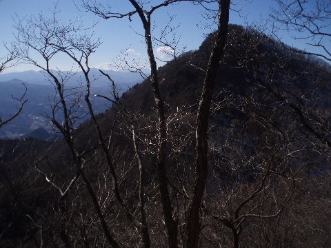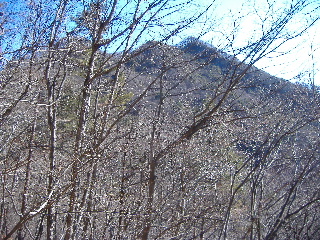 | 先に十二ヶ岳へ。今は落葉しているので木々の間から十二ヶ岳が見えています。 この時気温は3度。暖かです。 |