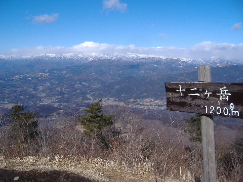 | 前日に行った上州武尊山の剣ヶ峰山での展望も見事でしたが、この十二ヶ岳も低山ながら素晴らしい展望台。雲ですっきりと見えない所もありましたが、聞きしに勝る大展望の名山でした(情報先はインレッドさん、mikkoさん)。 | ||