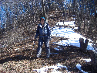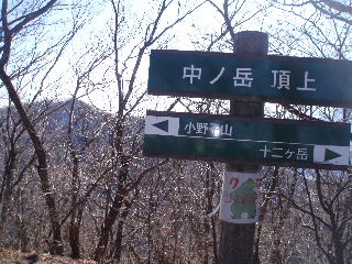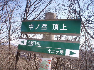 | そのお二人ともしばらくお話。お二人とも地元の方で、お一人は4週続けてここを歩いていて、前日も登ったと話していました(前日の十二ヶ岳山頂の素晴らしい展望と混雑ぶりはこの方からの情報)。それなのにそうとは知らず、この先の積雪情報を教えてあげたりして、もう冷や汗ものでした^_^; 他にも20キロ減量した話や浮腫みをとる方法を教えていただいたりと楽しかったなぁ〜。こんな出会いが山だよな〜(シミジミ・・・♪) そんなあったかい気持ちを戴いて、小野子山に行けなくても満足して中ノ岳へと戻ったのでした。 |