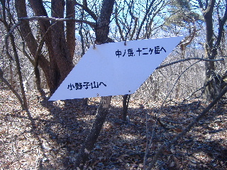 | 鞍部から少し行くと男坂、女坂の分岐(正面は十二ヶ岳山頂部)。 男坂から登ろうと思っていたのですが、ここで降りてきた4人組から男坂は雪がないが、女坂は日陰で雪があり、下りだったのでアイゼンを使ったと聞きました。 女坂は登りならばアイゼンはいらないと言うのを真に受けて、それならばと女坂を登りにすることにしました。 |