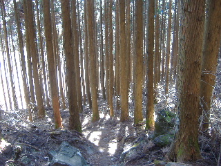 | 涸れた沢?沿いを行きます。最初は杉林で登山道は整備されています。 | ||||