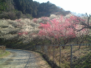 | バス停から少し戻り、中央本線の手前でバス通りを右に見て左側の林道を緩やかに登っていきます。 中央高速道路が横切った下を潜っていくと満開の梅林がありました。ラッキ〜! |