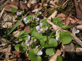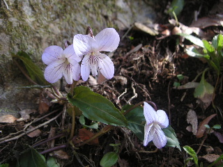 | 写真を写しながら進んでいくといろいろなスミレが咲き揃い、その度に側に寄ります。これじゃなかなか山頂に辿りつかないよ・・・(^-^; 北高尾山稜への登り口もありますが通過。最初は蛇滝口からそちらへ進もうとしましたが、この日は時間の余裕がないのでやめました。 |