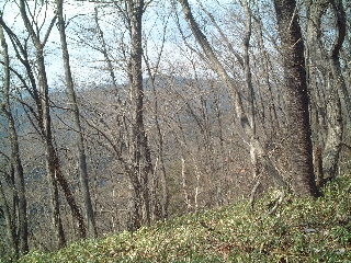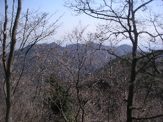| 落葉樹の間から裏高尾が見えます。もうかなり前に歩きましたっけ。あのアップダウンを見ると思わず「今日は歩かないで良かったね〜 (笑)」 山頂付近は落葉樹に囲まれた登山道。この辺りは季節を変えて、一年中楽しめそうです。 |