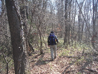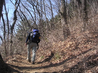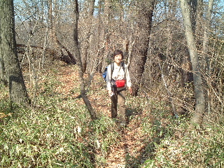 | 植林の巻道をいくより気持ちのいい広葉樹林の尾根道です。「得したね〜♪」 「そうだね〜」と、トシちゃん。 |