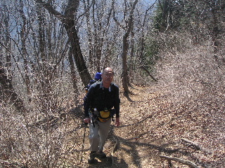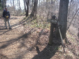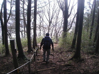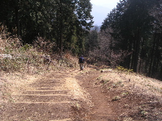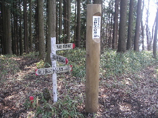 | 小仏バス停から登るとここで合流。今までは植林が多かったのですが、ここからは広葉樹林の気持ちいい山道になります。植林は檜の方が多かったかな? お陰で?帰宅してからも花粉症がまだお出ましになりません。律儀な来訪者だったのですが・・・。 |