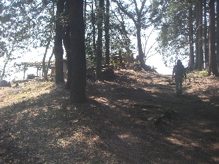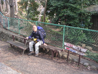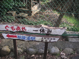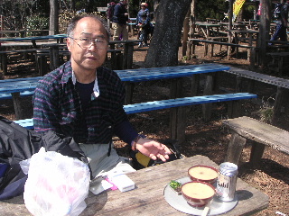 | 明王峠です。小屋(売店ですが)は営業していませんでした。土曜日なのにオジサンは具合がわるいのかな? ここからは富士山が見えるのですが、今回はここも霞んで見えませんでした。 残念ですがそれでも富士山の方向を向いて座り休憩。リンゴを戴きます。山で食べるフルーツは最高ですね。 |