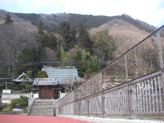| 鳥居を潜ると真言宗のお寺さんがあります。 歩いてきた山を振り返ります。その場所の下は・・ |