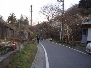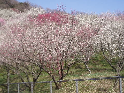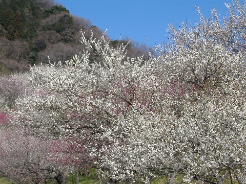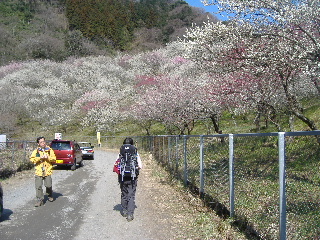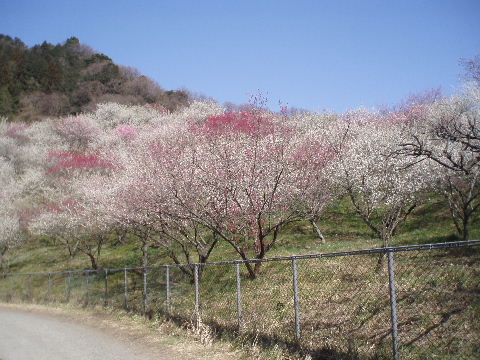 歩き始め、中央道を潜ると梅林がちょうど満開でした。 |