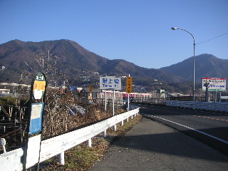 | 乗客は私達二人だけ。登山口に近いバス停がどこか尋ねると、わざわざ脇に停めて、地図を確認してくれました。とても親切な運転手さん > 富士急。 そして下車したのがこの殿上橋バス停。猿橋駅の一つ手前になるようです。 猿橋駅方向を見ると百蔵山(左)と扇山(右)が見えます。あちらからの富士山展望も素晴らしいですが、今回は・・・ |